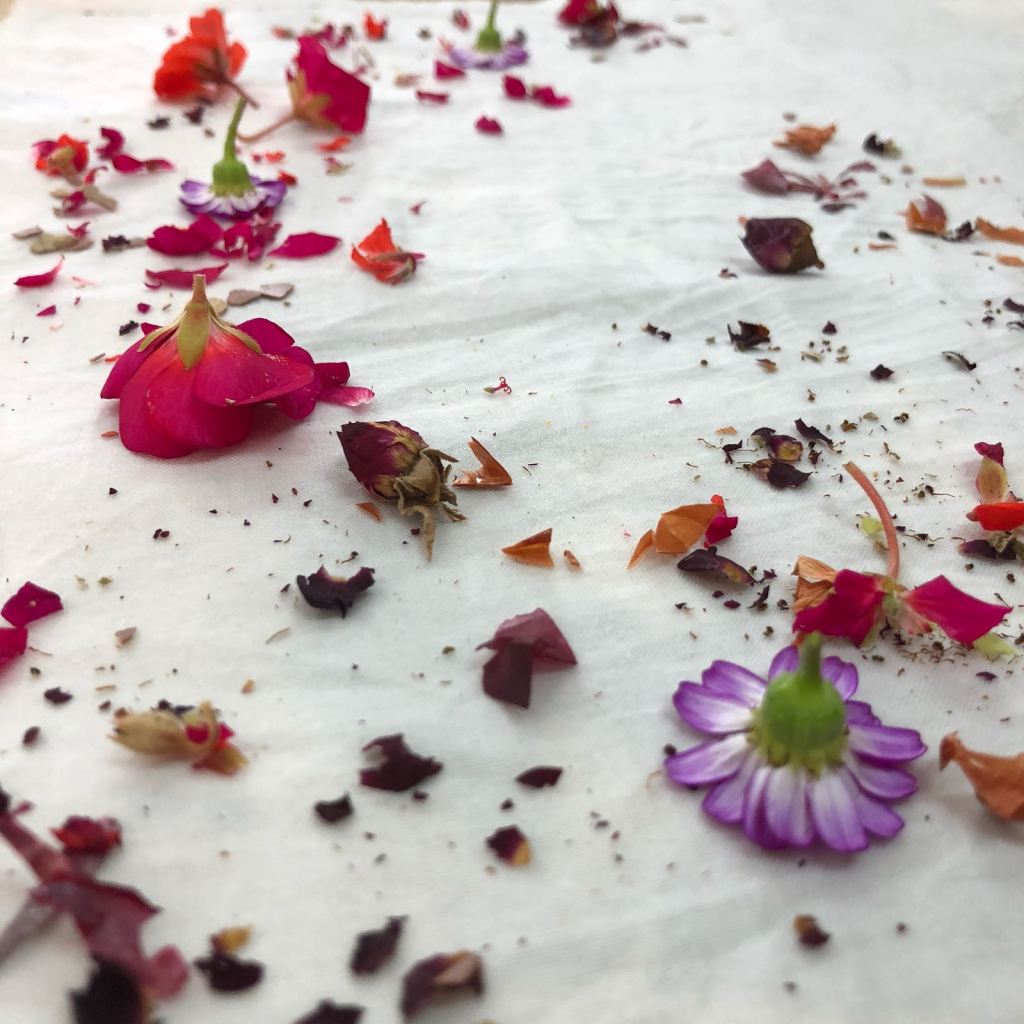 Todo el proceso para llevar a cabo una estampación botánica está lleno de magia y encanto. Desde la recolección de flores y plantas hasta el revelado de la tela tras la cocción. Es puro disfrute para los sentidos.